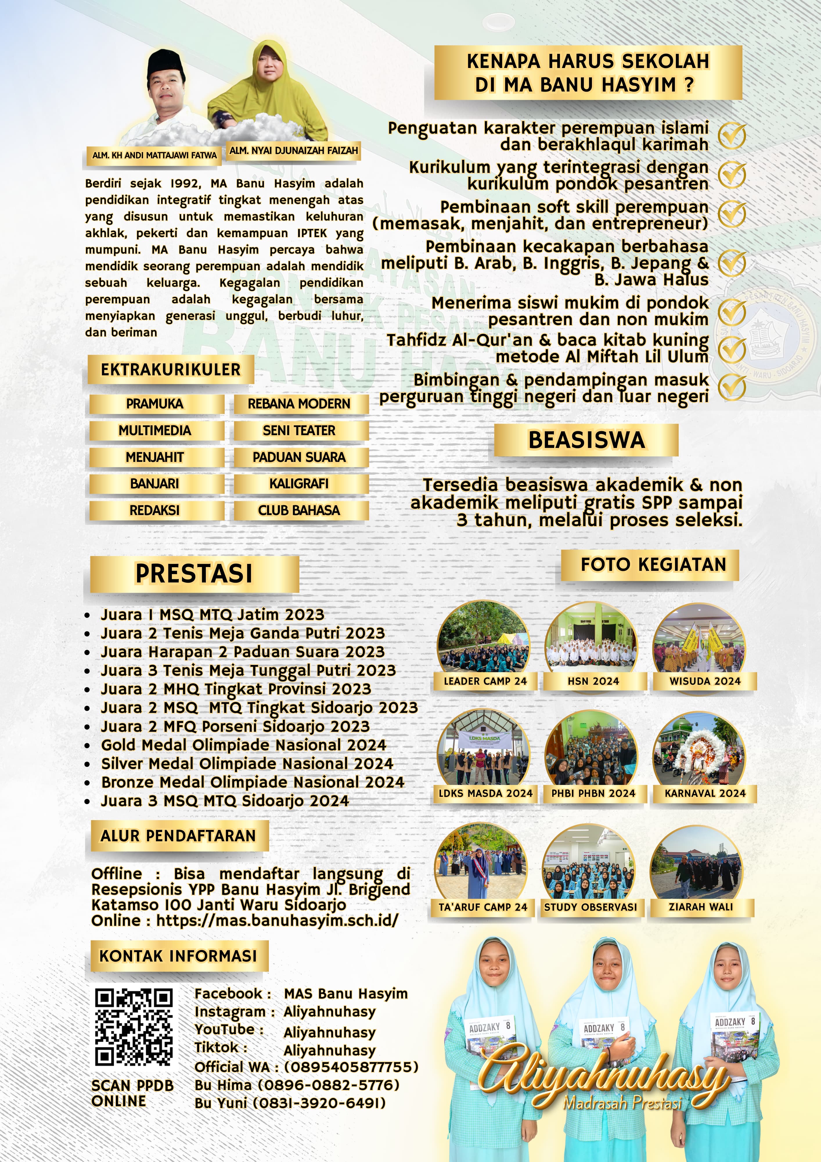 Kami mengajak seluruh calon siswa untuk bersama-sama mengeksplorasi potensi diri, berkolaborasi, dan membangun masa depan yang gemilang di MA Banu Hasyim. Mari kita sambut tahun ajaran baru ini dengan tekad dan harapan, serta semangat untuk meraih prestasi bersama.